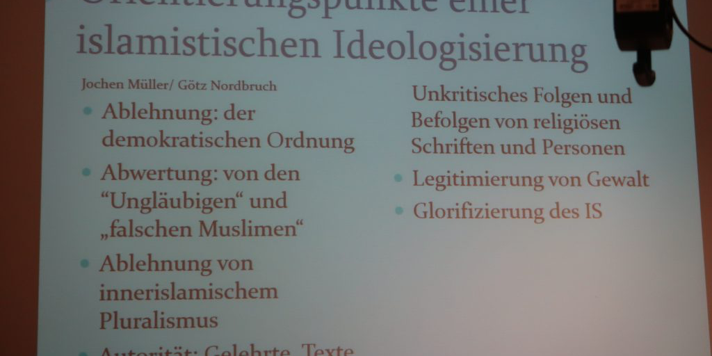 Die Teilnehmer erfuhren, dass entgegen landläufiger Vorurteile, Salafisten nicht an äußeren Merkmalen, wie Kleidung, Bart oder Kopftuch zu erkennen sind, sondern dass die Jugendlichen, welche sich in der Vergangenheit gewaltbereiten Terrorgruppen angeschlossen haben, eher dem Typus unscheinbarer Junge von nebenan entsprachen. So war der Anteil deutschstämmiger Konvertiten deutlich erhöht. Vernachlässigung durch hohe berufliche Belastung der Eltern, Abschottung der Jugendlichen und unreflektierter Internetkonsum über PC oder Smartphone sind besondere
